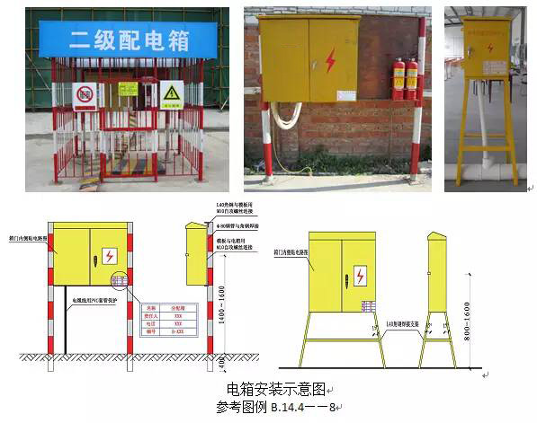 3、配電箱、開關箱應裝設端正、牢固;固定式配電箱、開關箱的中心點與地面的垂直距離應為1.4~1.6m;移動式配電箱、開關箱應裝設在堅固的支架上,其中心點與地面的垂直距離宜為0.8~1.6m。(JGJ46-2005第8.1.8條)